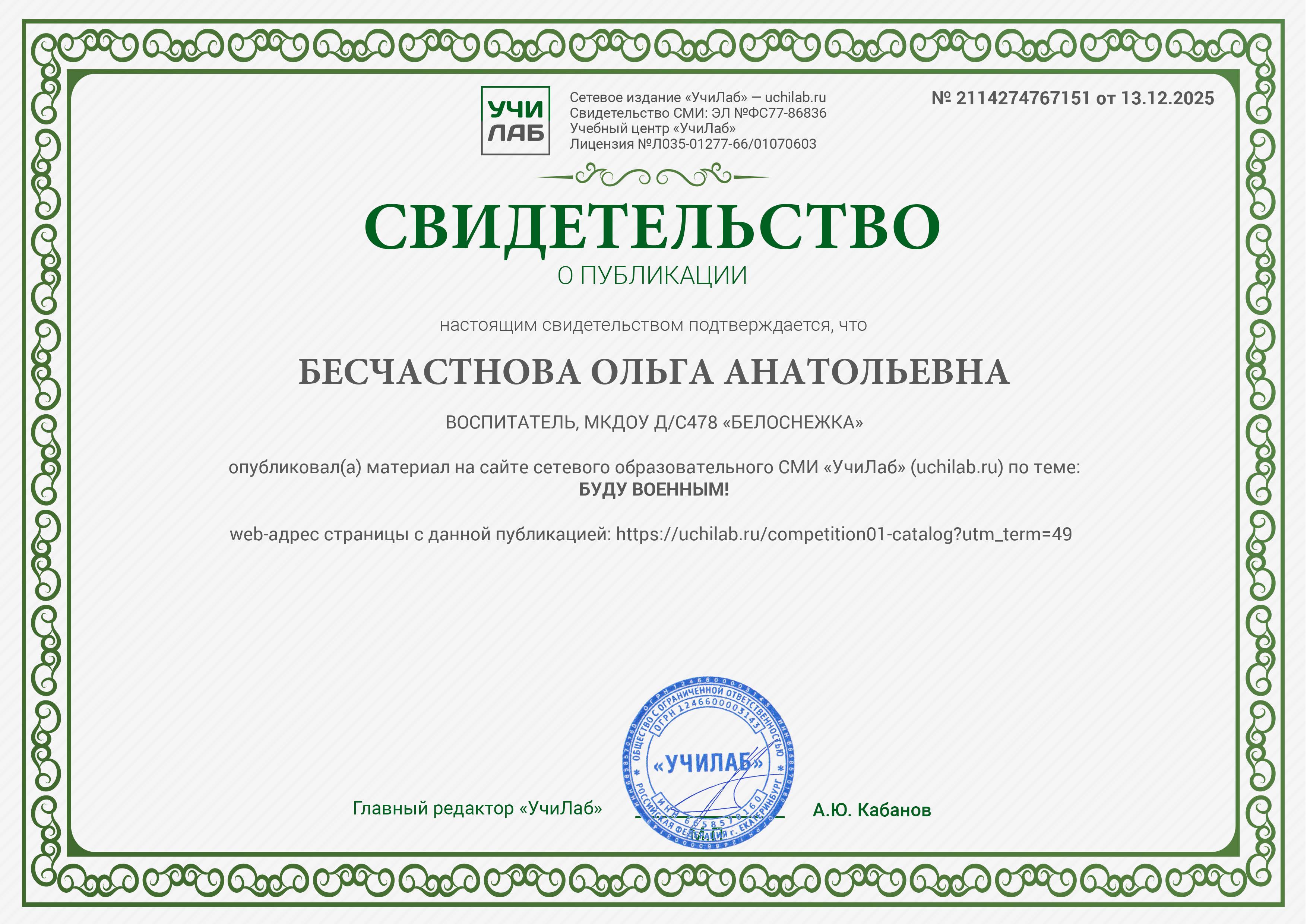 Свидетельство о публикации